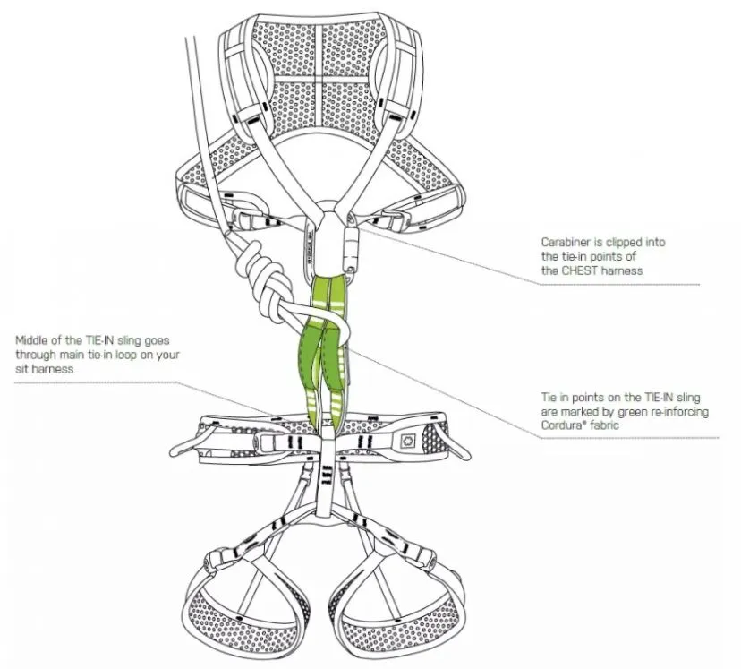 La Tie-in Sling inclusa ti permette di collegare il pettorale all’imbrago basso in tutta sicurezza.