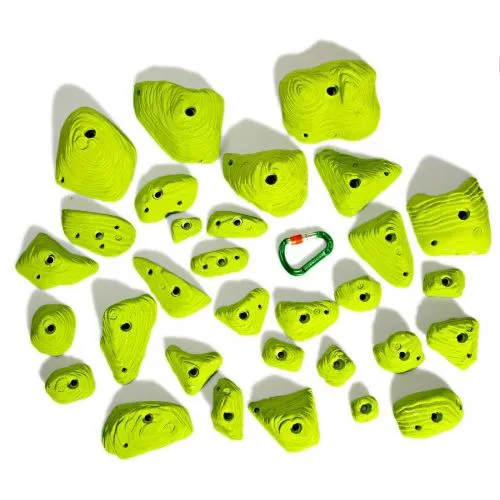 Il set Smog contiene trentuno prese tacche da arrampicata, realizzate in poliestere.
